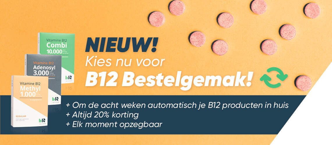 B12 Bestelgemak is er speciaal voor onze loyale klanten die maandelijks B12 vitamines bestellen. Voor deze klanten hebben we nu B12 Bestelgemak ontwikkeld, waardoor je altijd een automatische nieuwe voorraad B12 vitamines van ons ontvangt. Het mooiste van allemaal? Je ontvangt altijd 20% korting op iedere bestelling!