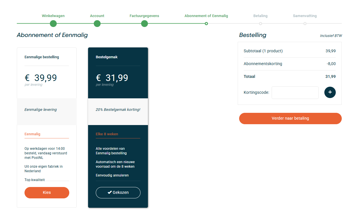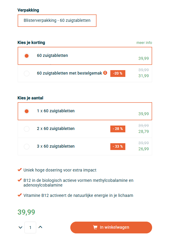 Navigeer naar je favoriete product vanuit het productoverzicht met alle B12 vitamines. Selecteer het gewenste product, vervolgens heb je de keuze voor een eenmalige bestelling of bestelgemak en krijg je van ons altijd 20% korting!